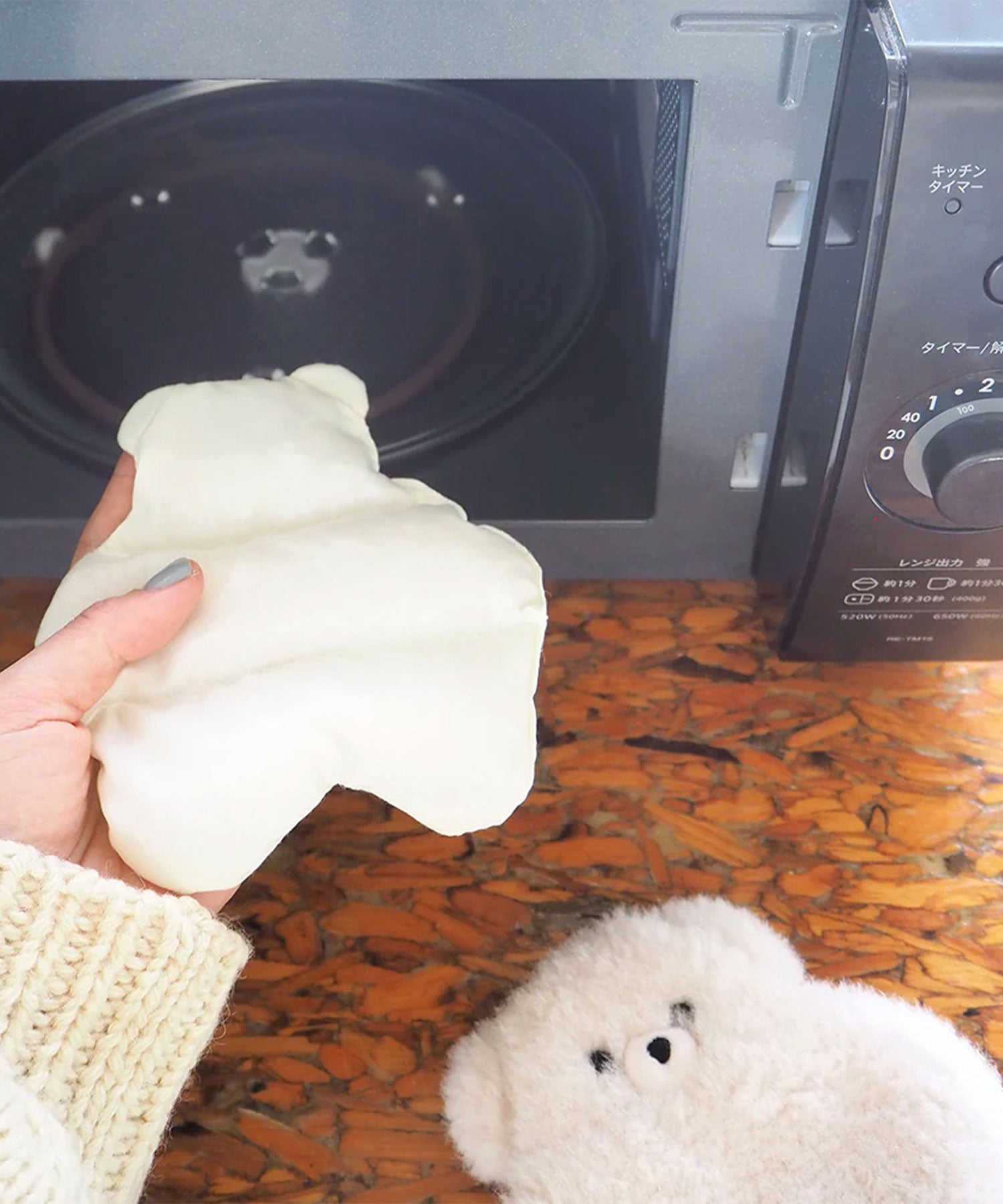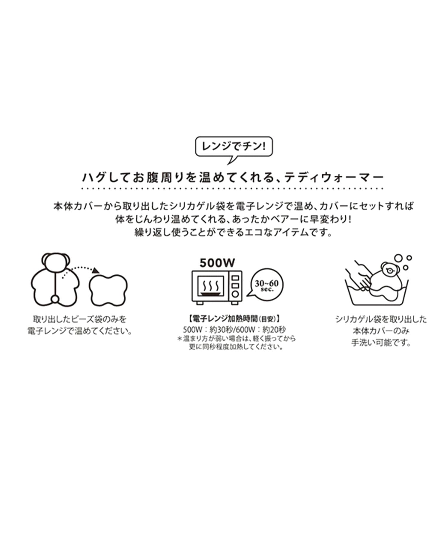 本体から取り出したシリカゲル袋をレンジで温め、カバーにセットすれば体をじんわり温めてくれる、あったかベアーに早変わり。繰り返し使うことができるエコアイテムです。
