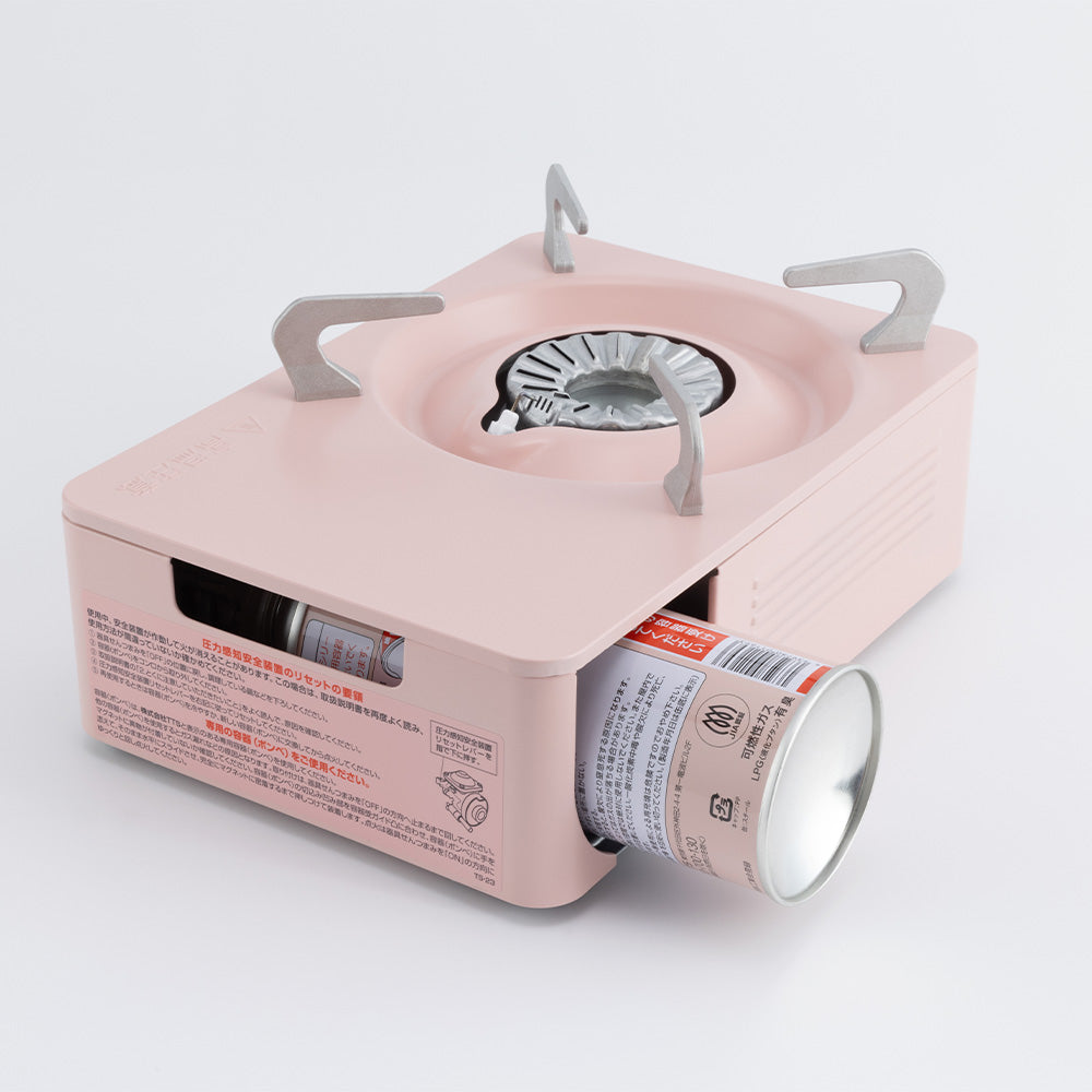 コンロ本体の凸部分とボンベ部分の凹部分を合わせてグッと押し込みます。マグネットとくっ付いたら装着完了!着脱するときはボンベ部分を引っ張って外します。