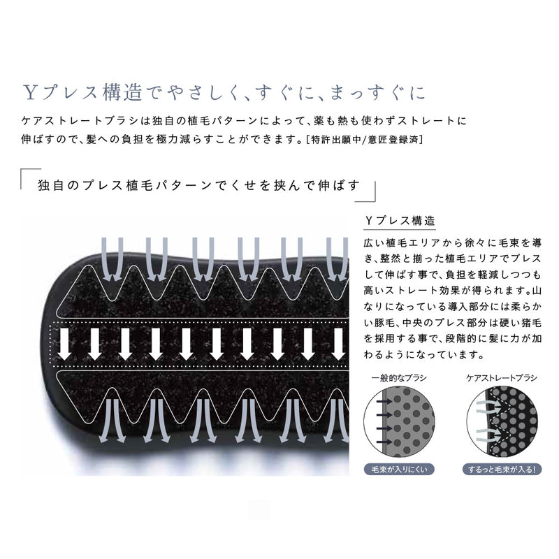 入口部分が広い植毛エリアから徐々に毛束を導き、その後整然と揃った植毛エリアでプレスして伸ばす事で、負担を軽減しつつも高い効果が得られる事を実現しています。