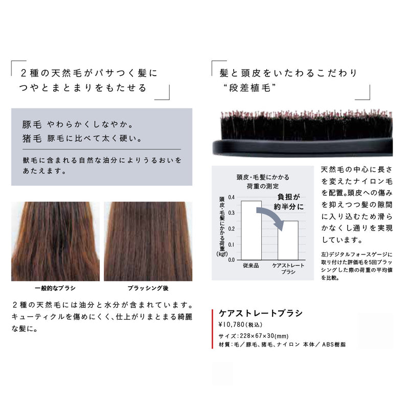 また、導入部分には柔らかい植毛、プレス部分は硬い植毛を採用する事で段階的に髪に力が加わるようになっています。