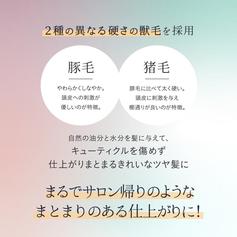 植毛に採用されている素材は天然の獣毛を採用。獣毛に含まれる油分により、梳かす度に髪に潤いとツヤを与えます。髪通りを良くするため長さもあえて不均等になるよう植毛し従来の獣毛ブラシで欠点とされていた、頭皮への当りの強さも樹脂毛を中心に配置する事で解消しています。
