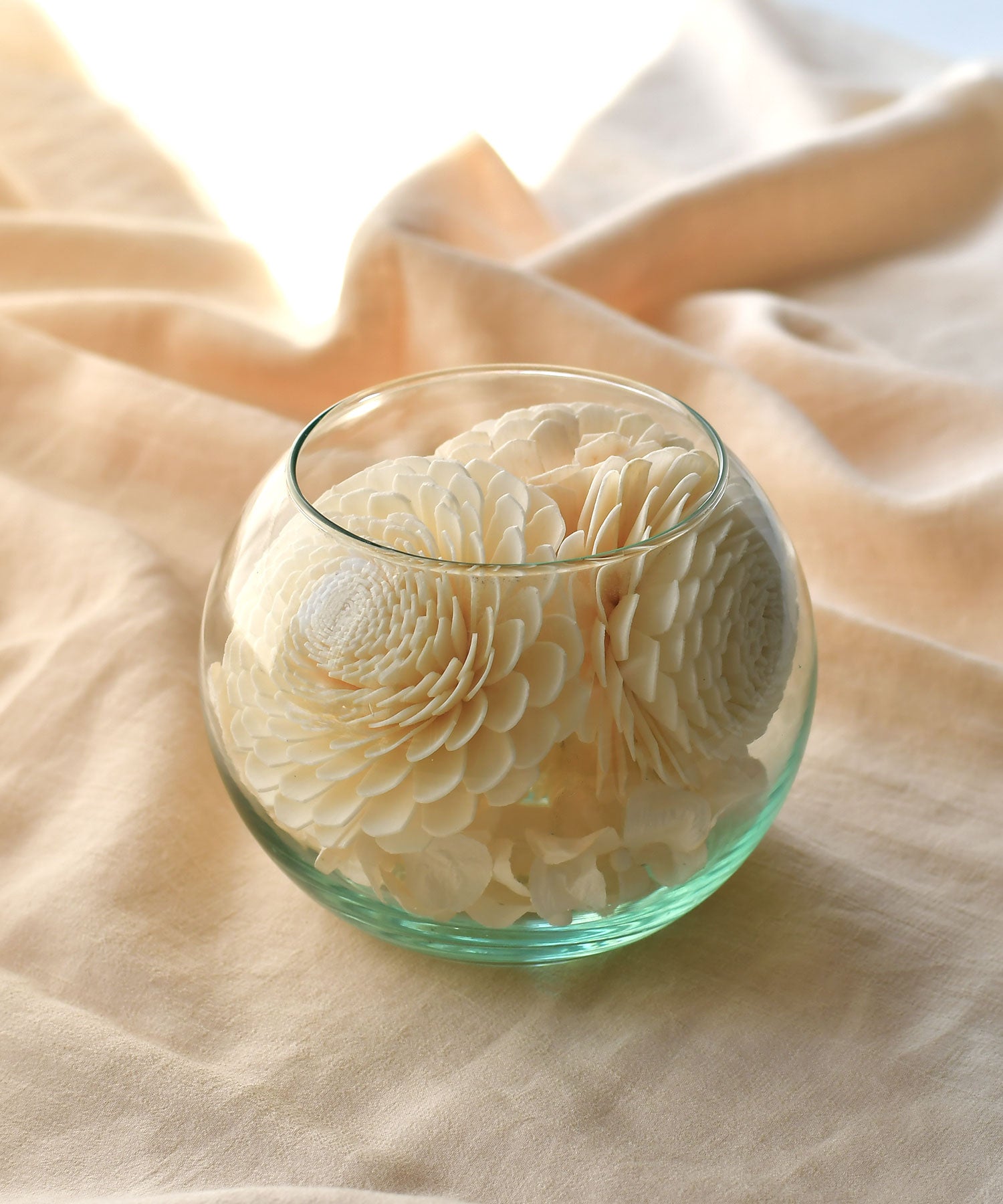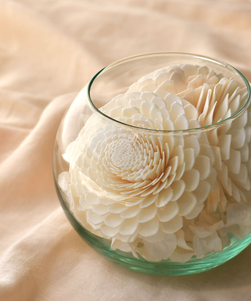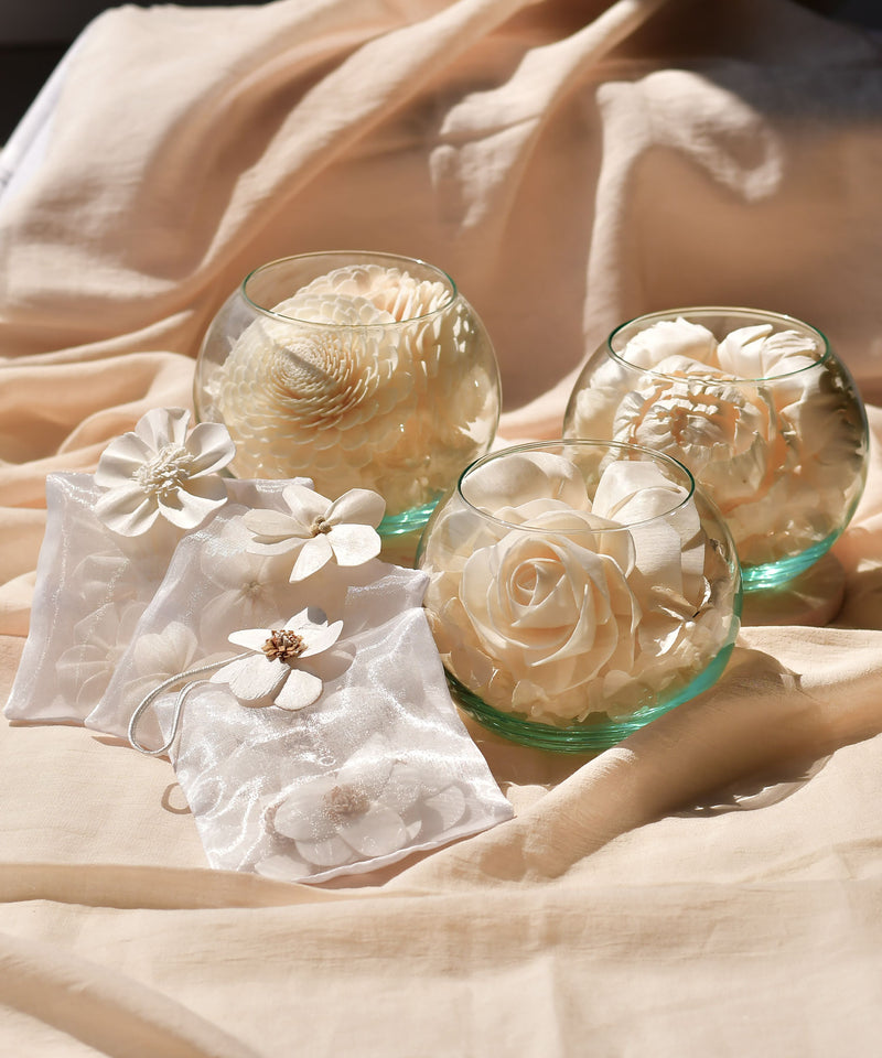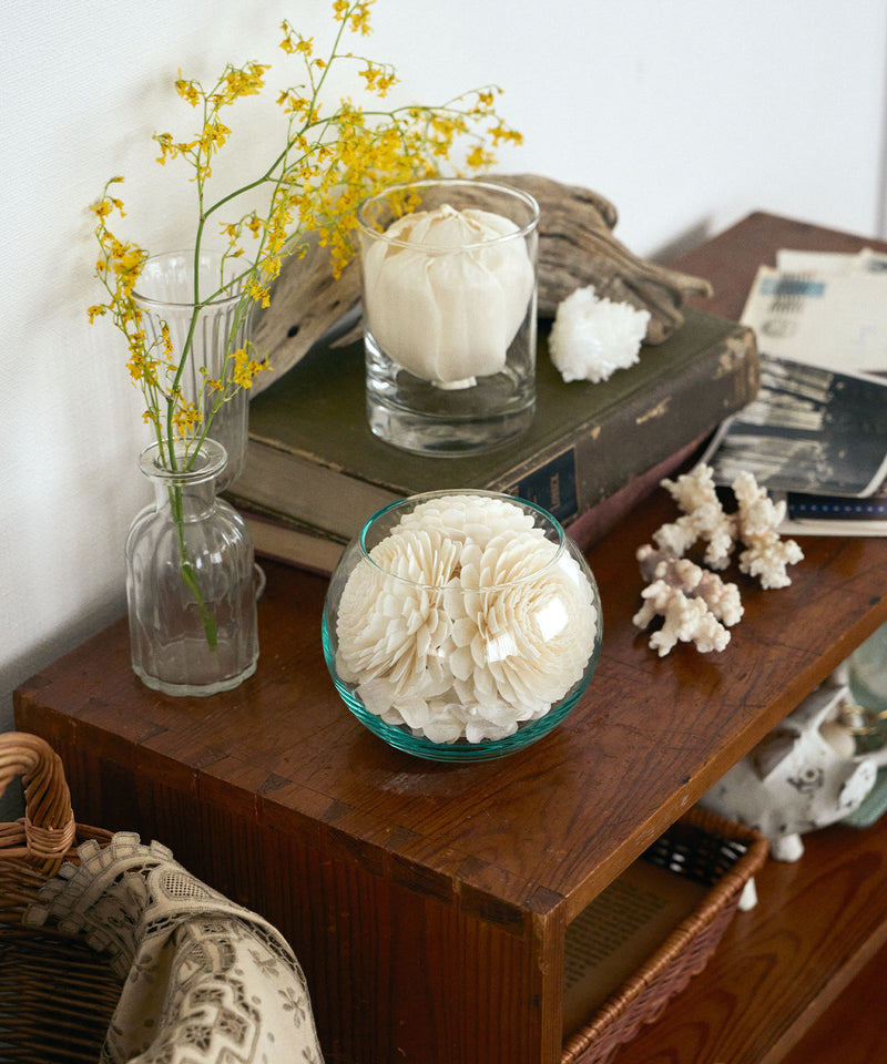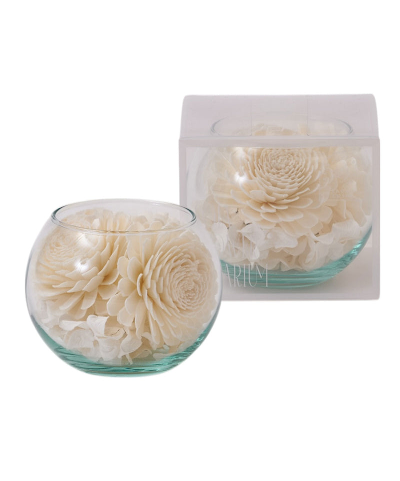 タイで収穫されるソラの木の中で最も白く、最も太く生えてくる地域のソラを使い、高品質で純白度の高い美しいソラフラワーをシンプルなグラスにあしらった、テラリウムのような香り付きポプリがソラリウム。お部屋や玄関などにそっと置くだけでやさしい香りが空間に広がり、ガラスを通した穏やかな光が忙しい毎日にそっと癒しを与えてくれます。