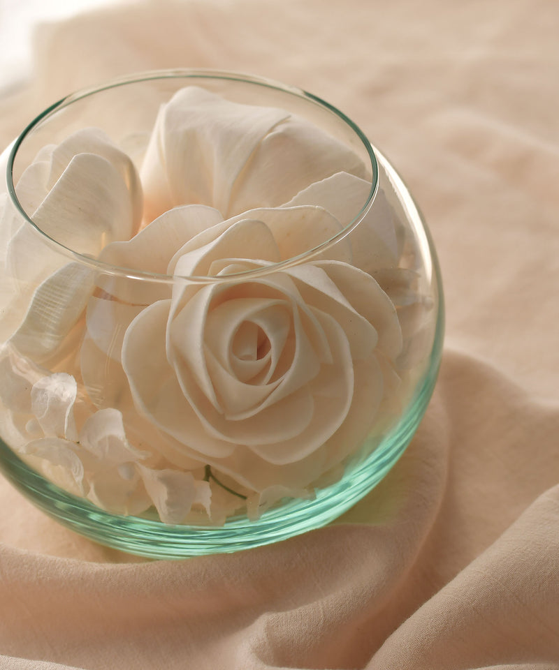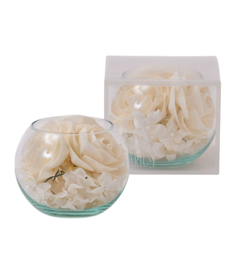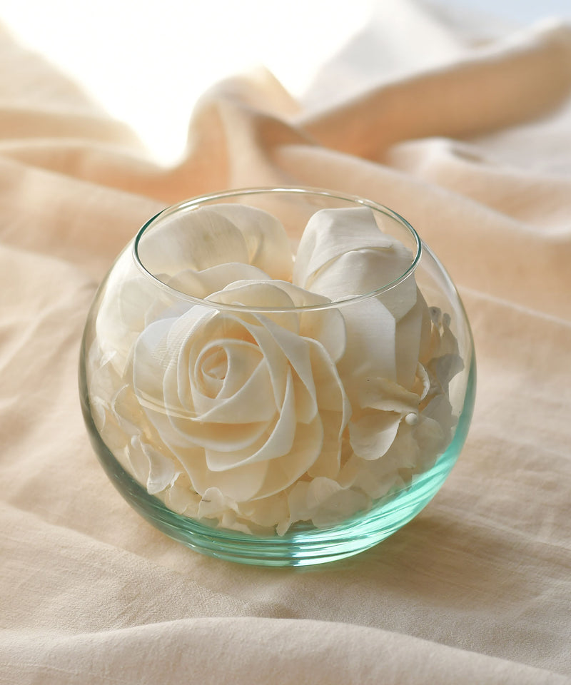 タイで収穫されるソラの木の中で最も白く、最も太く生えてくる地域のソラを使い、高品質で純白度の高い美しいソラフラワーをシンプルなグラスにあしらった、テラリウムのような香り付きポプリがソラリウム。お部屋や玄関などにそっと置くだけでやさしい香りが空間に広がり、ガラスを通した穏やかな光が忙しい毎日にそっと癒しを与えてくれます。
