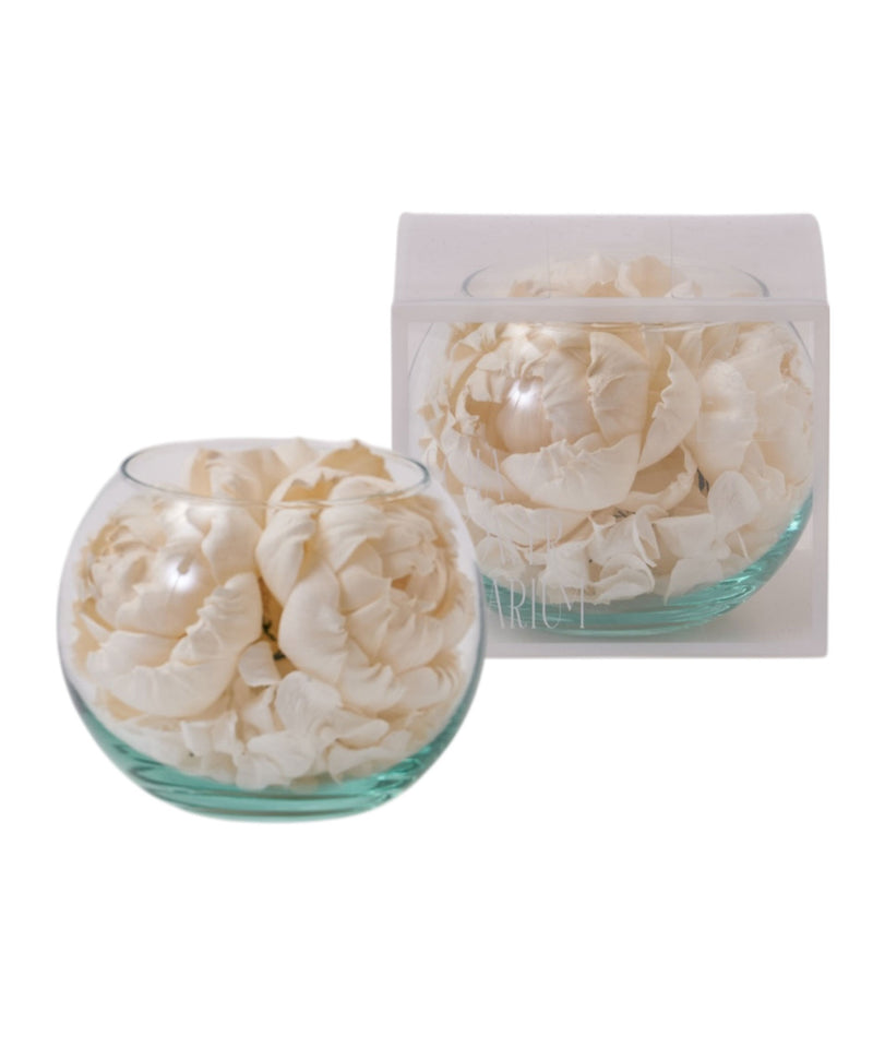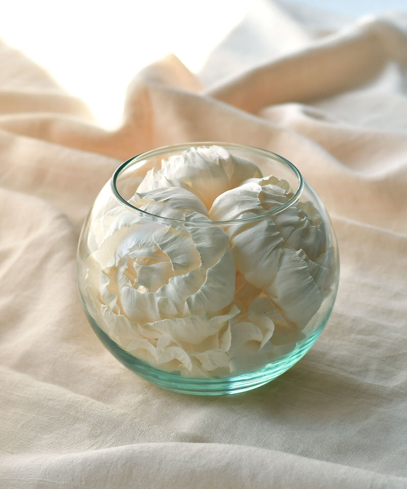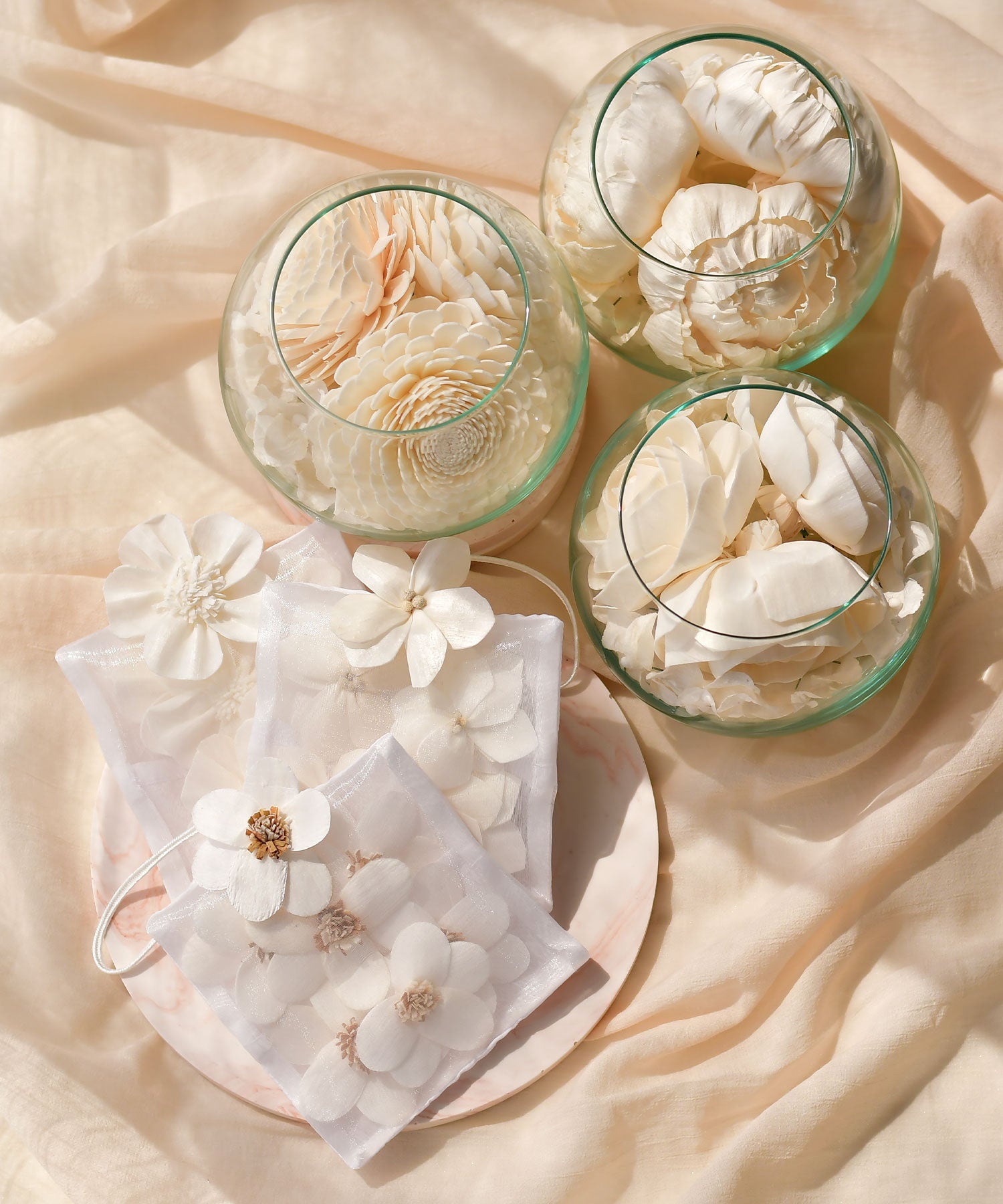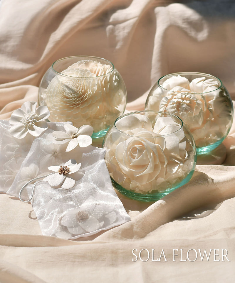 タイで収穫されるソラの木の中で最も白く、最も太く生えてくる地域のソラを使い、高品質で純白度の高い美しいソラフラワーをシンプルなグラスにあしらった、テラリウムのような香り付きポプリがソラリウム。お部屋や玄関などにそっと置くだけでやさしい香りが空間に広がり、ガラスを通した穏やかな光が忙しい毎日にそっと癒しを与えてくれます。