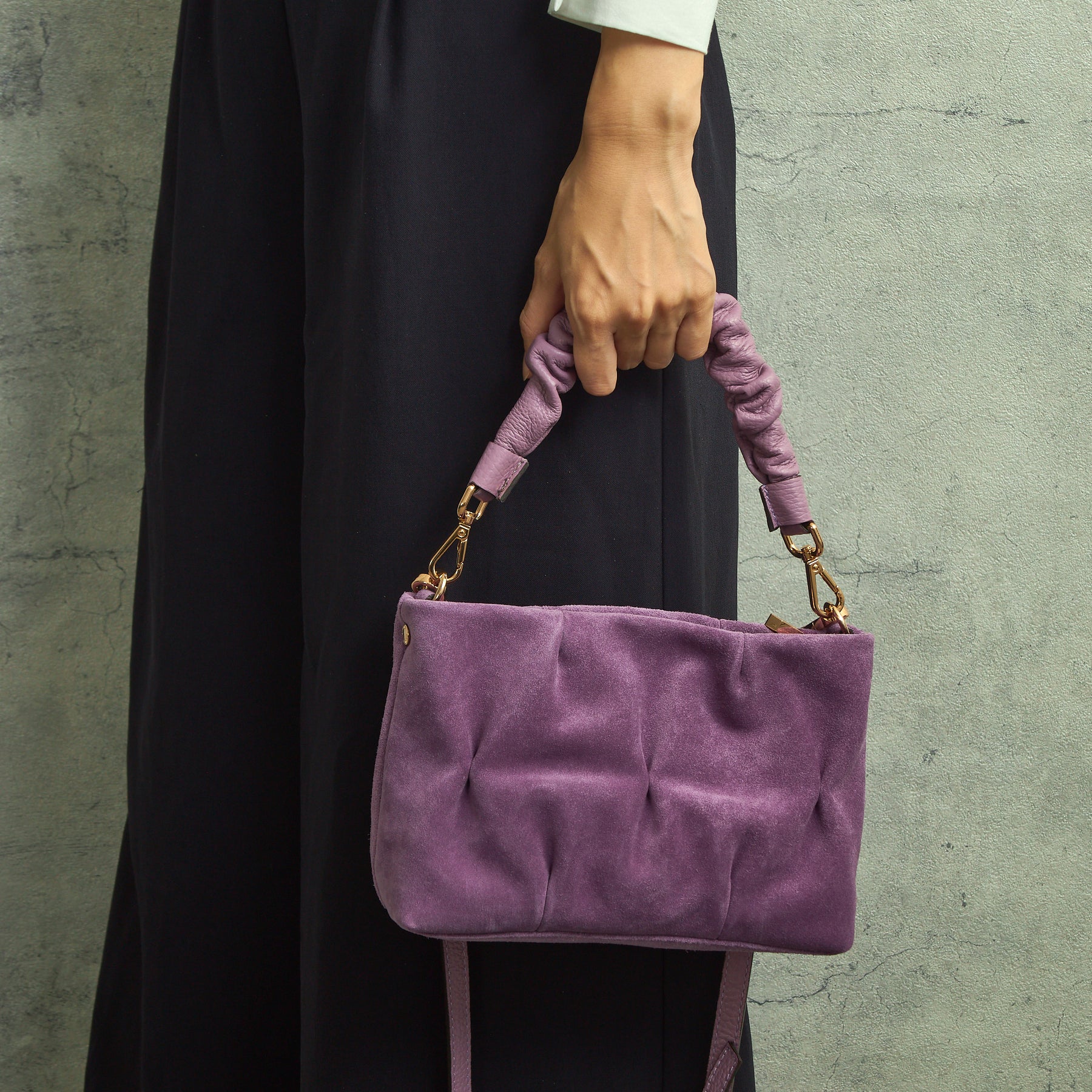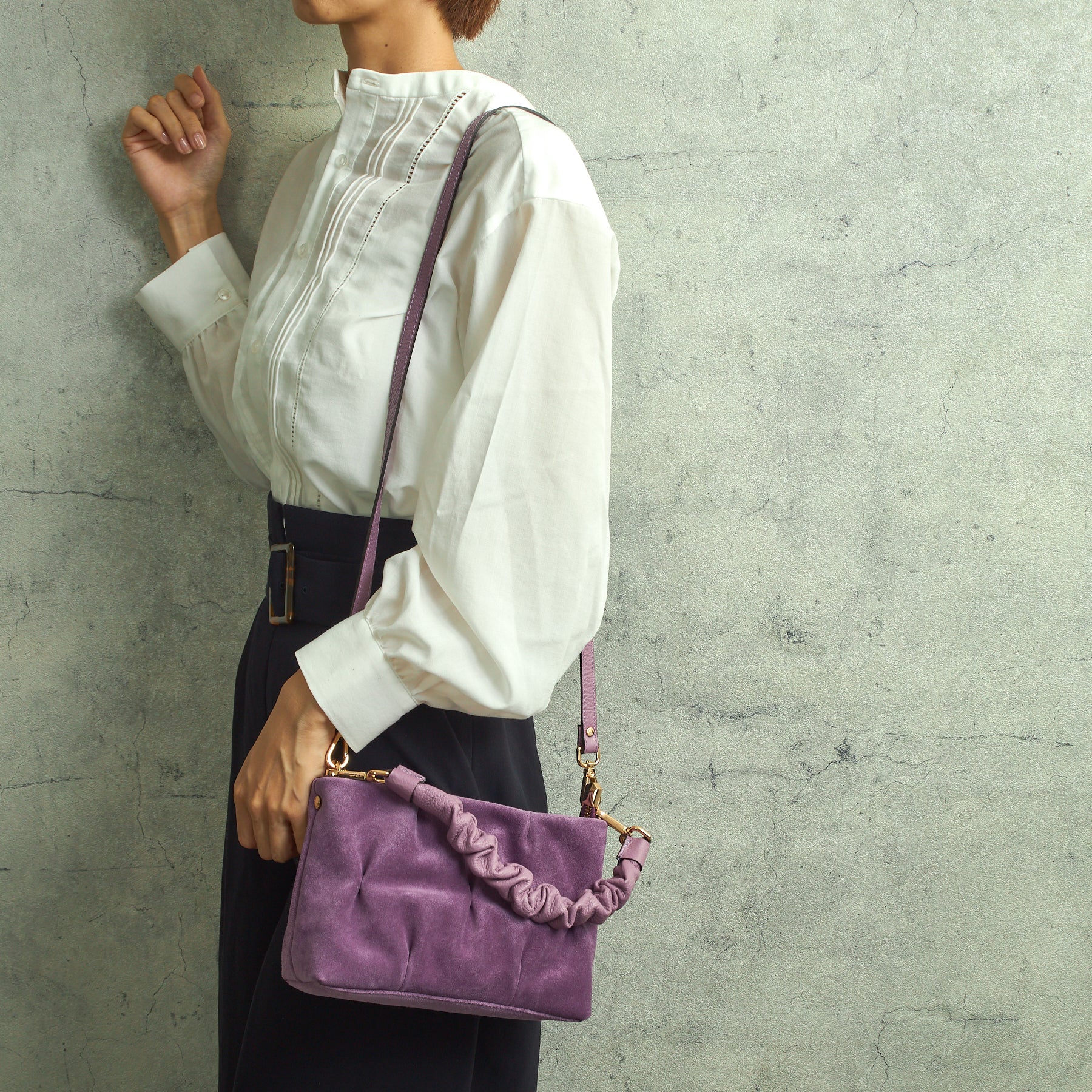 スエードの優雅な佇まいが美しいバッグ。